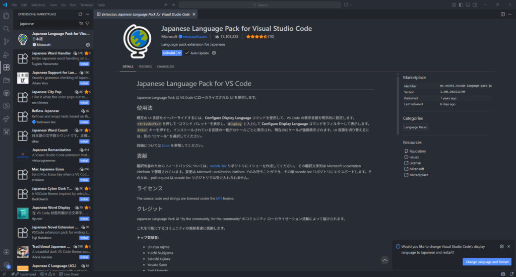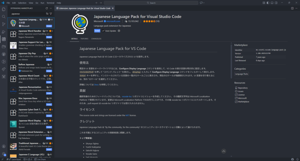 左側のExtencionsを開き、入力欄に「japanese」と入力します。