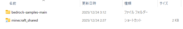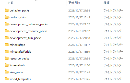 この中にある📁development_behavior_packsと📁development_resource_packsがアドオン開発用フォルダになります。