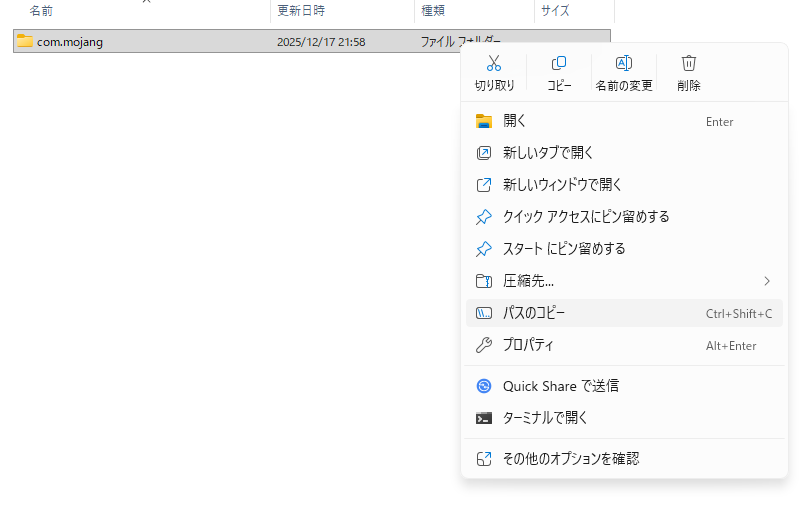 一つ前の階層(📁com.mojang)に戻り、📁com.mojangを選択してから、右クリックしてパスのコピーを選択します。