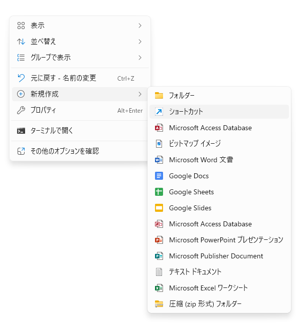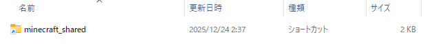 最初に作ったマイクラ統合版用のフォルダ(記事では、📁minecraftBE)を開き、右クリックして、新規作成→ショートカットを選択します。