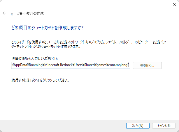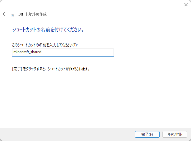 「次へ」を押し、ショートカットの名前を入力します。名前はなんでもいいですが、わかりやすいように、ここでは、「minecraft_shared」としました。