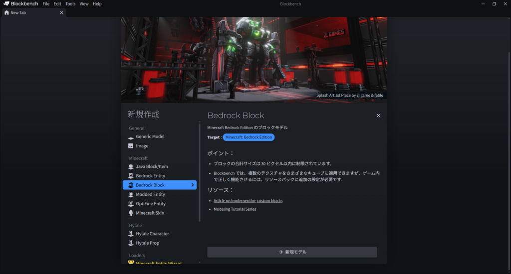 Bedrock Blockはマイクラ統合版のブロック用のプロジェクトです。新規モデルを押すことでプロジェクトが作成されます。