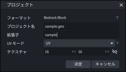 プロジェクト名には、作ったモデルを保存するときのファイル名を記入します。アドオンで使うジオメトリ(モデル)のファイル名は「ジオメトリ名.geo」とすることが多いです。