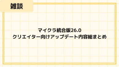 導入2026年2月11日、マイクラ統合版v26.0がリリースされました。今回からバージョン番号のシステムが「年に基づく形式」へと大きく変更されています。本記事では、アドオン制作などの技術的な側面におい...